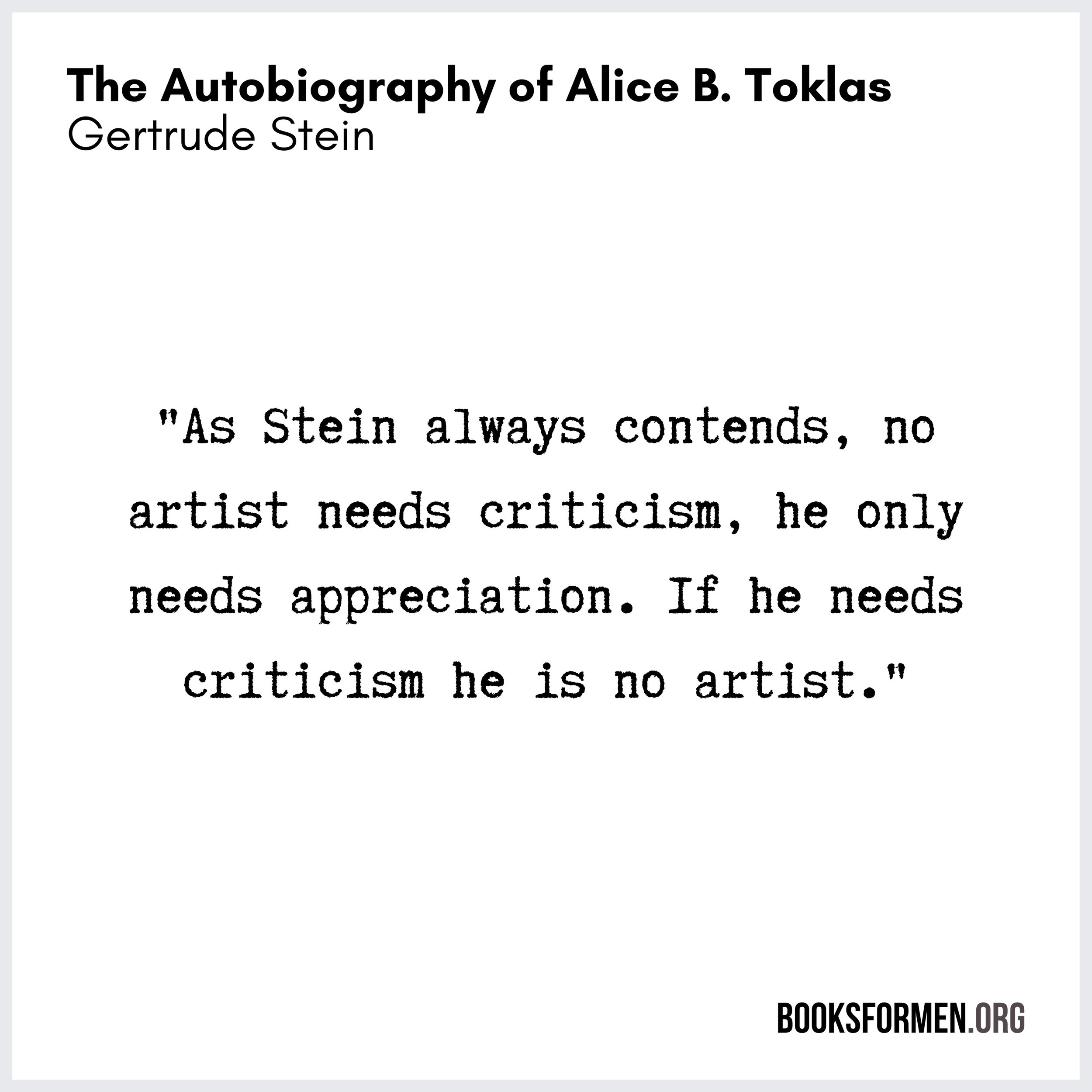 05:53 - And Stein writes, and remember, she's writing about herself. She's talking about Stein. “She began to tease me and say that I should write my autobiography. Just think she would say what a lot of money you would make. She then began to invent titles for my autobiography, My Life with the Great Wives of Geniuses. I have sat with my 25 years with Gertrude Stein,” and then she continues on. “When Ford Madox Ford was editing the Transatlantic Review, he once said to Gertrude Stein, I'm a pretty good writer, and I'm a pretty good editor and a pretty good businessman, but I find it very difficult to be all three at once. I am a pretty good housekeeper and a pretty good gardener, and a pretty good needle woman, and a pretty good secretary, and a pretty good editor, and a pretty good vet for dogs. And I have to do them all at once. And I found it difficult to add being a pretty good author.” And so I found this quote to be very amusing, because of course, Stein then wrote the autobiography for her, and it's pretty much noted historically that she did it for money, like she says in this quote.